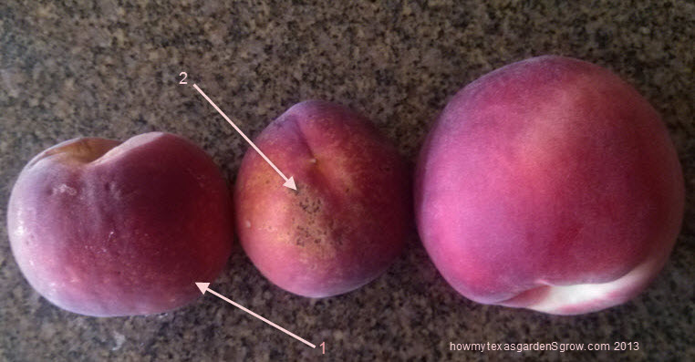 ?This peach (left) has minimal damage at this point so it can be washed –or the spotted area can be cut out–and the peach can be eaten. Crops that are organically grown (without chemicals) often have spots and blemishes (look next time you are in the produce section at a grocery store).