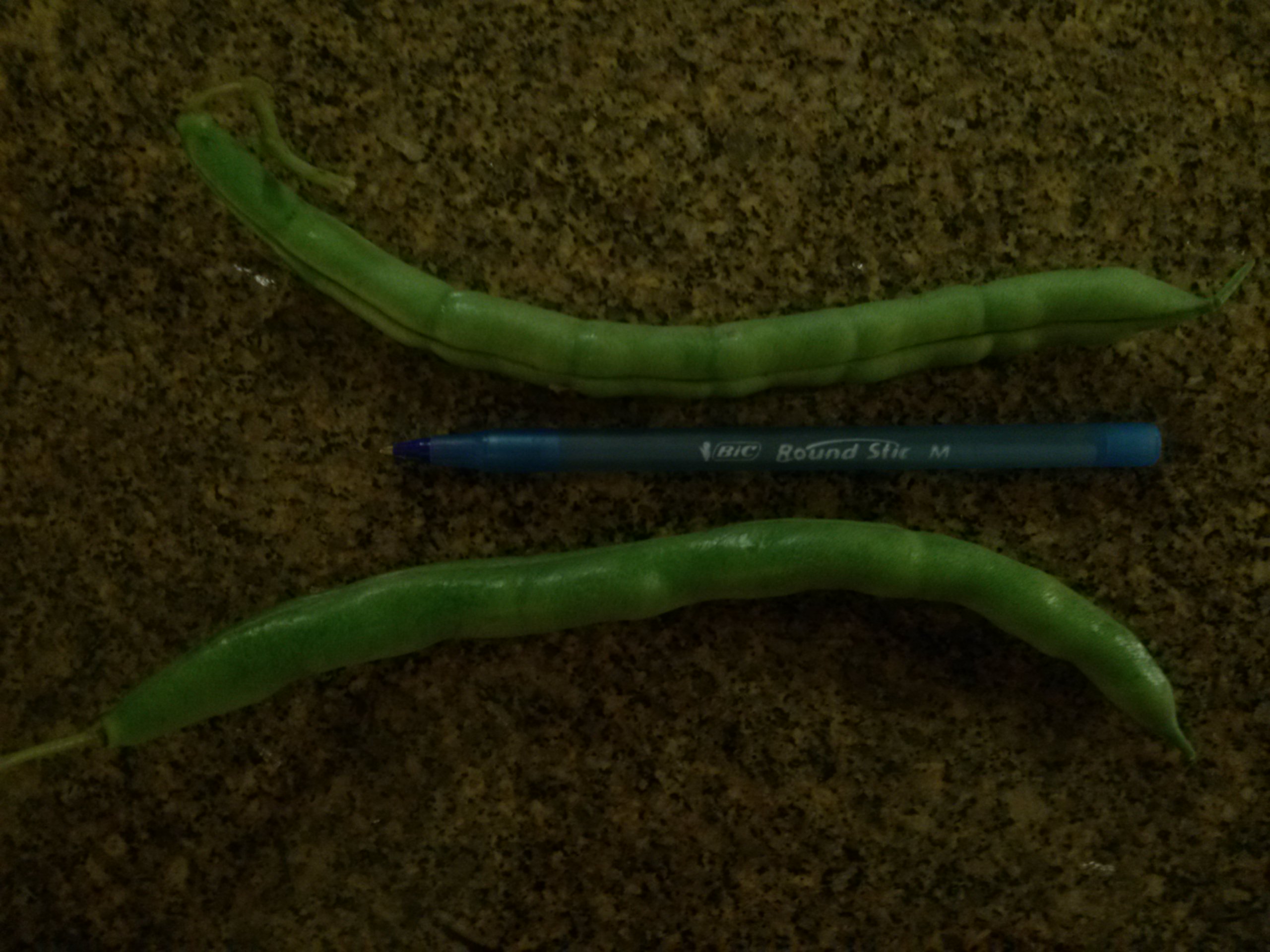 The top picture (green beans growing) was taken on November 6, and the bottom picture (extra large green beans are shown relative to the size of a blue writing pen) was from the last picked beans (November 27) before the freeze.