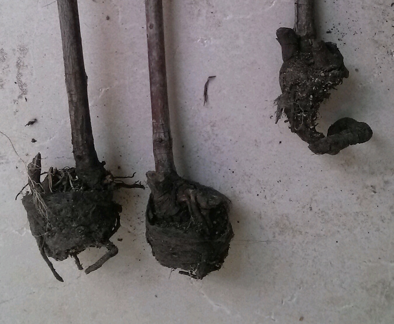 These dead plants were dug up to make room for the onions planted in early February. Once out of the ground, the problem was obvious. Notice how the roots are in the shape of a much smaller container–the plant was probably kept in a “too small” container for too long—causing the roots to grow in circles.
