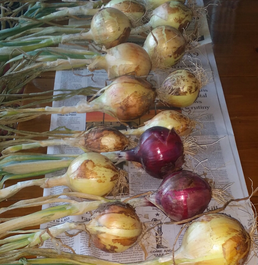 Post harvest bulb rot is the greatest threat to successful storage of onions. The key to success is to dry onions in relatively cool (75 to 85 degrees F) and dry (low humidity) conditions. If our weather is cooperative, we can dry them on a table in the garage. I have also dried them on a table in the house (see “Onions Drying”).