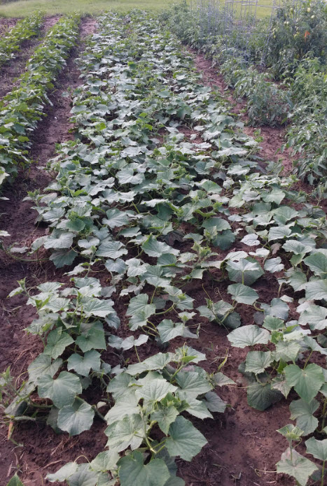 What a year this has been for cucumbers! The mild temperatures and frequent rains just encourage them to grow! This year, the first 2 sets of planted cucumbers were damaged by late frosts in May — our 3rd planting produced an abundance of these “Market More” variety plants.