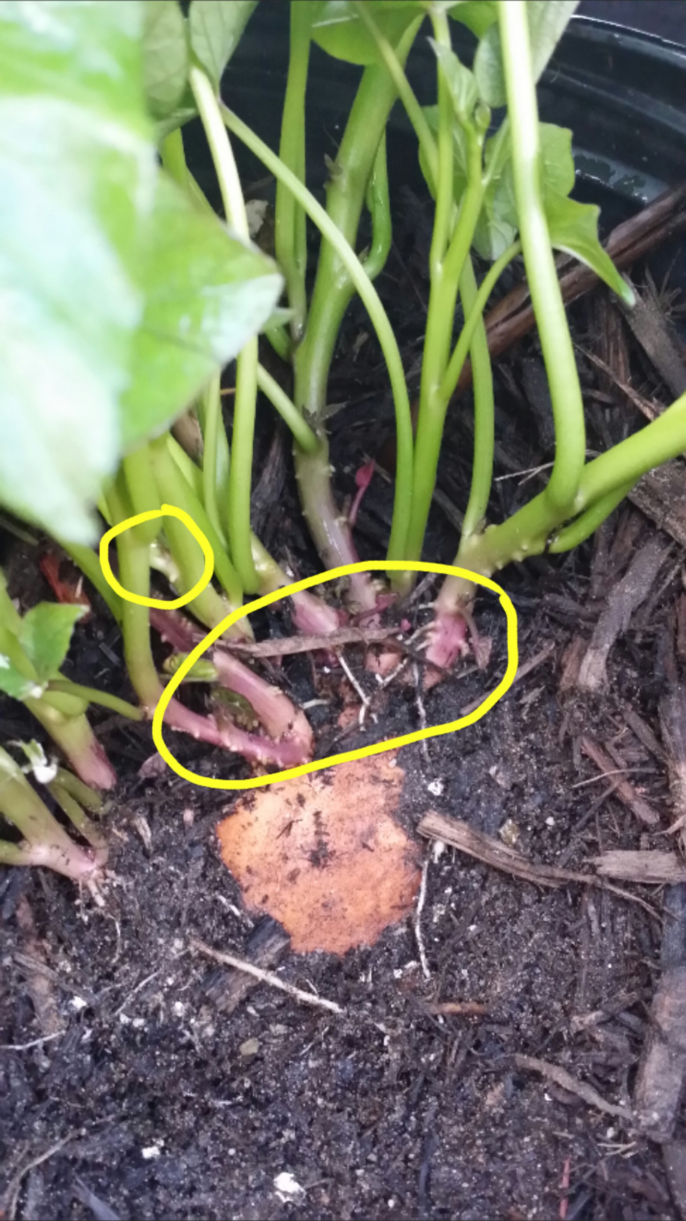 In the photo (left), the base of the plants are pink and protruding root structures are becoming visible (see yellow-circled areas). These “slips” are easily snapped off at the base and can then be planted in the prepared garden soil. I planted two slips in each spot (6 spots) and hoped that at least one would grow.