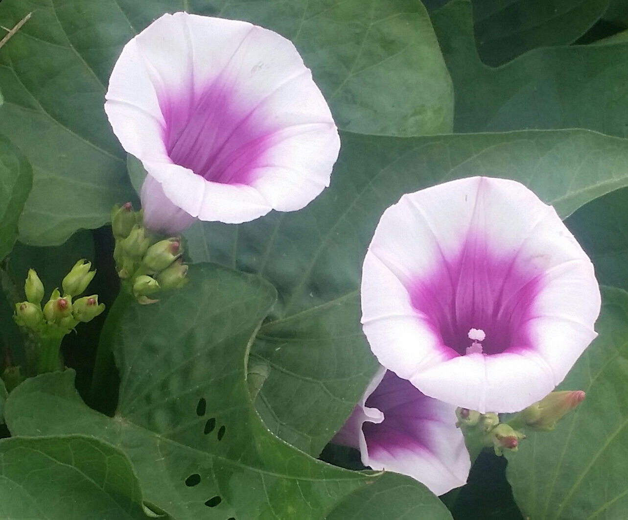 An interesting note about sweet potatoes, they will bloom but do not make seeds—just flowers—and looking more carefully at the flower reveals the kinship of sweet potato’s relationship to common morning glories (think about it, they vine and the below ground parts are very similar—with the exception that sweet potatoes have fantastic flavor (as well as being loaded with both macro-nutrients and micro-nutrients!).