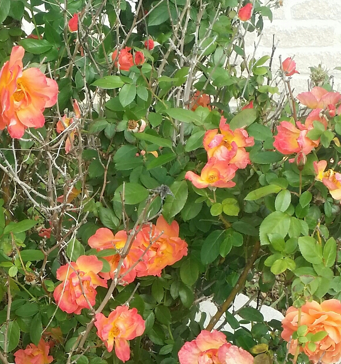 This rose should not be near a walk way due to its voracious thorns. Really good rose gloves (the long ones that cover the arm to nearly the elbow) should be worn any time the rose is “handled”. This one stays because I love the colors in the flowers — every color seen in a beautiful sunset (including the purples, but only in Spring).