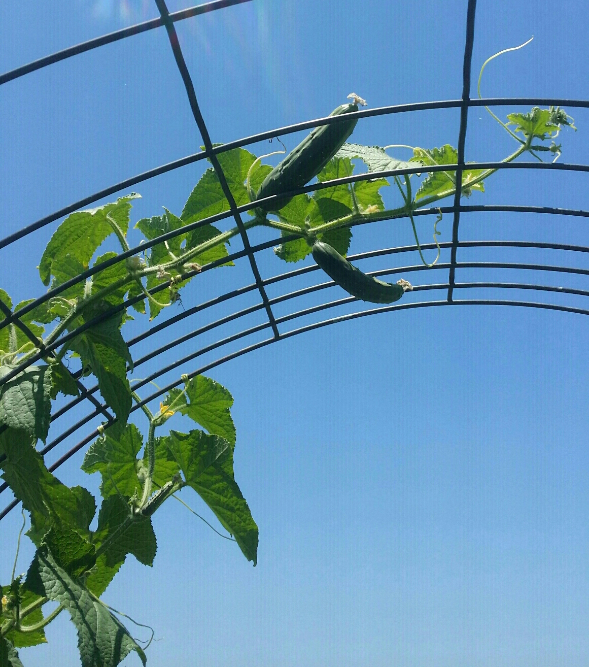 This is the second year we are growing the variety “MarketMore” cucumbers in the garden; and the first year we’re using an arched trellis to grow the vines.