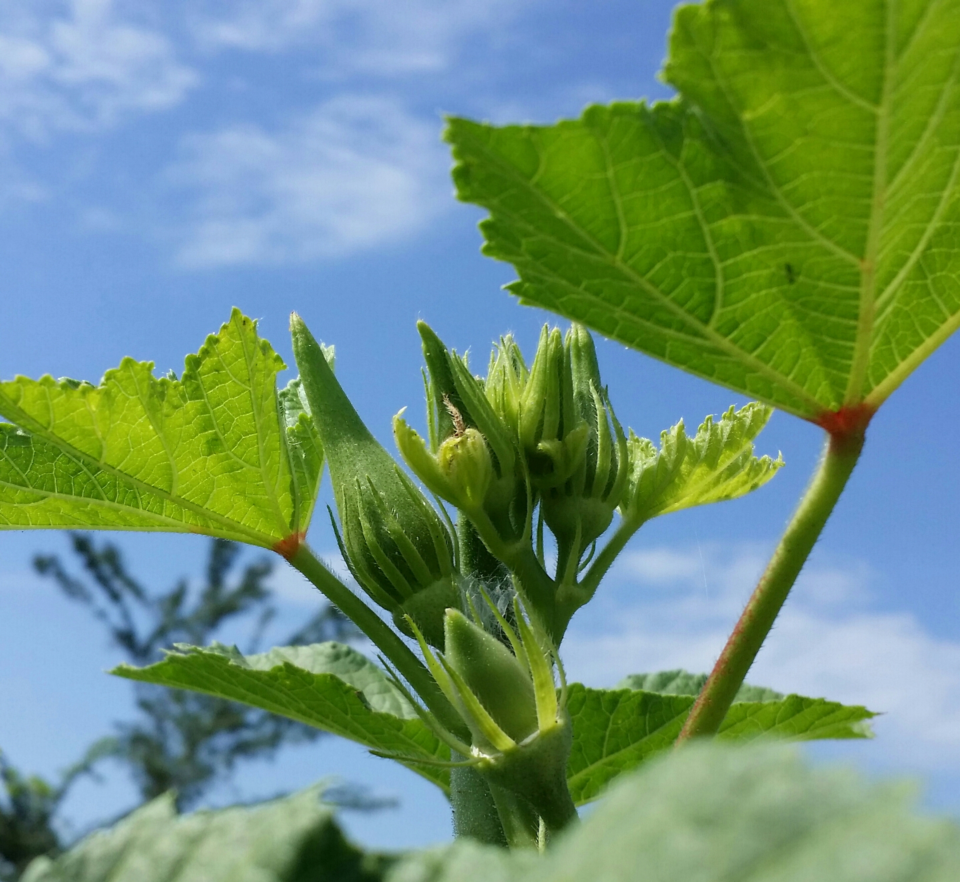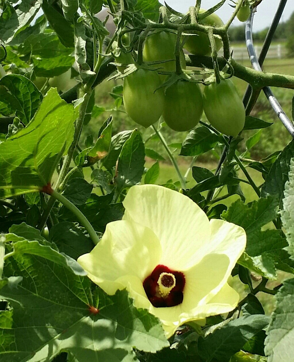 If you’ve ever looked closely at an okra flower and noticed that it looks a lot like a hibiscus flower, your not imaging things — they are in the same family of plants (Malvaceae — the mallow family). You will find cotton in this same family as well!