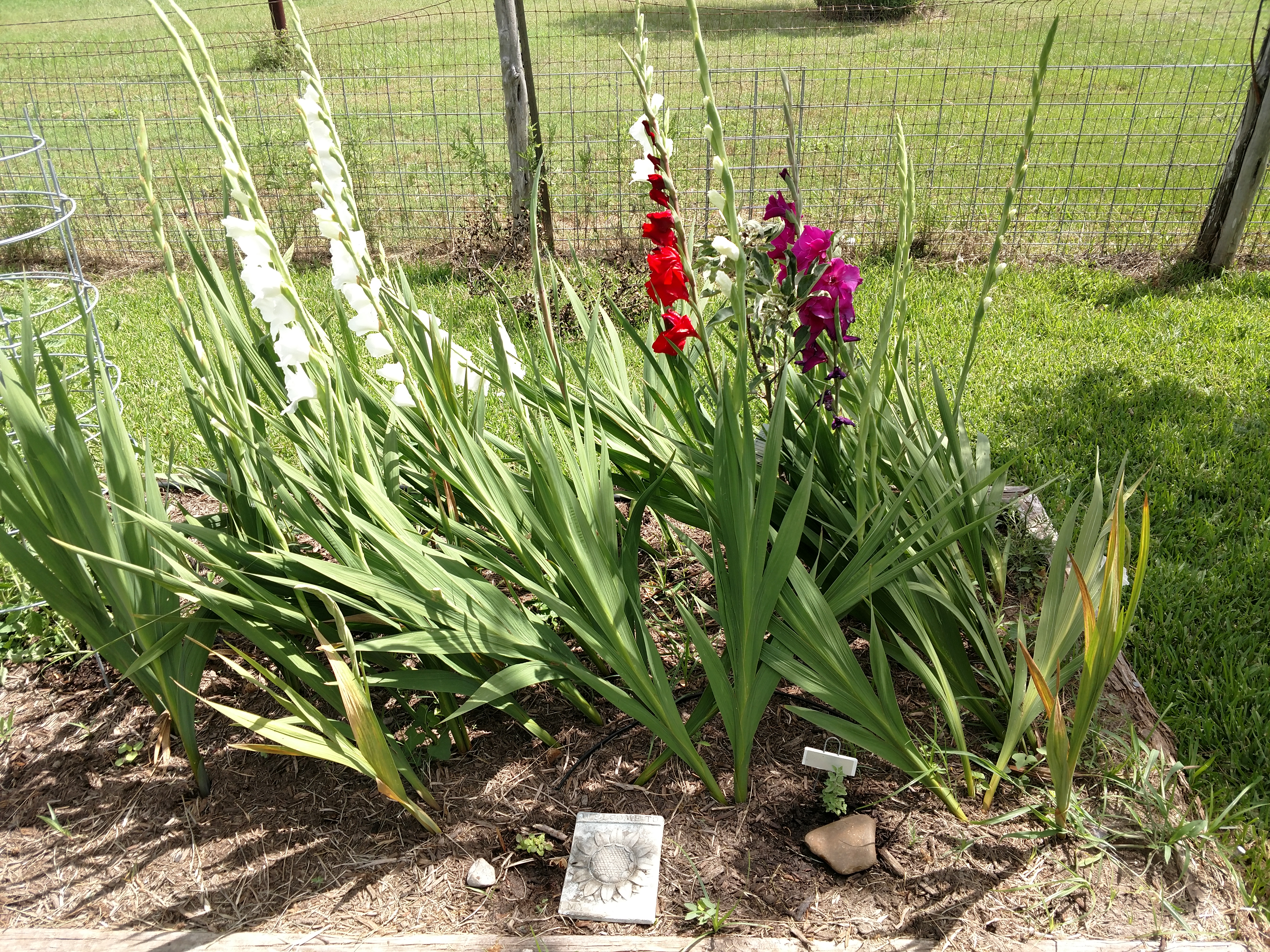 The varied weather of Spring produces gladiola plants that are not straight and picture perfect—so don’t be discouraged if you see something like this—picture below—just let the plants to continue to grow and then cut fresh flowers as they are ready. As the summer temperatures and length of day increase, the plants will die back. Let them continue to grow until they brown, then cut back to the ground and some of them may return the next year (if the bulb has not rotted). Or, cut the plant at the soil (once flowers are harvested) and add excess plant material to the composting area. My experience—about 10% of the bulbs will return the following year, but they grow much smaller, so I usually just buy more bulbs.